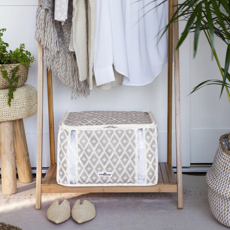 Alabada por Ángela Porras en el minirreportaje de Antena 3, la caja de almacenamiento al vacío es sin duda el producto estrella de Compactor. Comprime la ropa voluminosa en una sola aspiración y ayuda a los usuarios a ganar hasta un 75% más de espacio en sus armarios. Así, sin esfuerzo, las pertenencias se mantienen en buenas condiciones, protegidas del polvo y la humedad. Este concepto revolucionario fue inventado por Giulio Epicureo, el fundador de Compactor, y sigue patentado hasta hoy.
