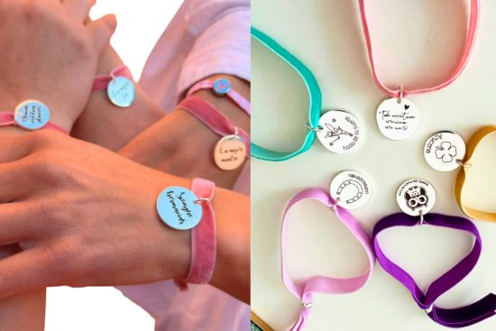 En esta misma línea, se encuentran las pulseras de terciopelo con medalla grabada, ideales para damas de honor, hermanas o amigas cercanas. Estas piezas permiten elegir el mensaje, el tipo de medalla y el color del lazo, con opción de descuentos por cantidad en packs de 4, 6 u 8 unidades.