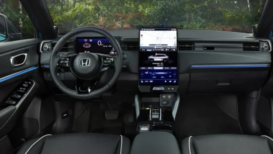El Honda e:Ny1, tiene un habitáculo completamente renovado en comparación con su hermano híbrido, el HR-V. Hay un grupo de instrumentos digitales de 10’25 pulgadas, además de una enorme pantalla táctil vertical de 15’1 pulgadas en el medio del tablero para información y entretenimiento.La interfaz de esa pantalla táctil masiva, se divide en tres áreas únicas: una sección superior para la navegación y el software del teléfono inteligente, una sección central dedicada a las funciones de audio y vehículos eléctricos, y la sección inferior restante para los controles de calefacción y ventilación.