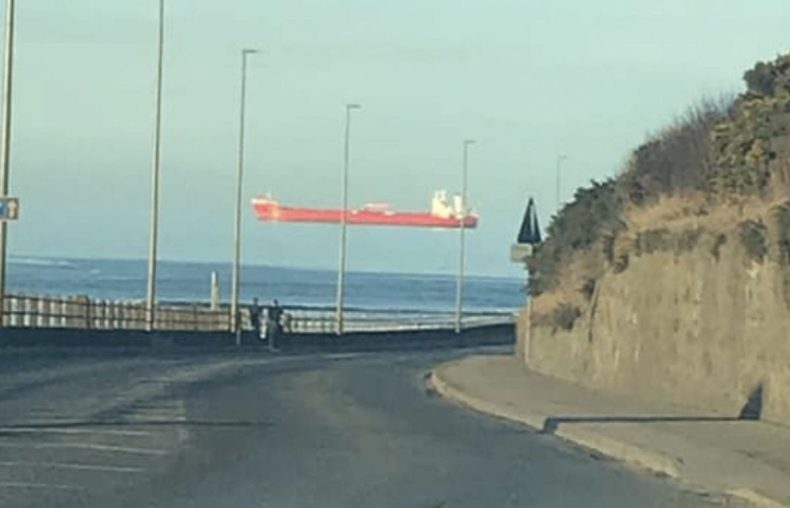 Un joven escocés compartió en Facebook la espectacular imagen de un carguero que parece estar suspendido en el aire cerca la costa de Banff (Reino Unido) .