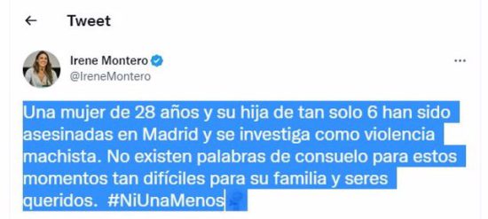 «No existen palabras de consuelo para estos momentos tan difíciles para su familia y seres queridos. #NiUnaMenos», ha escrito Montero en su perfil de Twitter.
