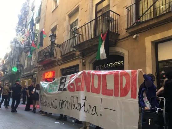 La acción «denuncia la impunidad por el genocidio contra miles de palestinos» y se enmarca en la concentración convocada este sábado a 18 horas en Barcelona bajo el lema ‘Paremos el genocidio en Palestina, basta comercio de armas con Israel’.