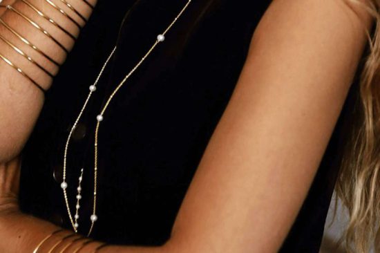 El catálogo de Trepillé muestra diversas opciones para llevar las perlas a cualquier hora y en cualquier ocasión. Propuestas como los collares largos rompen los esquemas tradicionales al unir cada perla con cadenas de bolitas doradas, como el modelo de 46 centímetros de largo, para llevar con una o dos vueltas. Este modelo trae una anilla para jugar con la altura en cualquier posición, y es perfectamente combinable con los chokers de figuras geométricas.