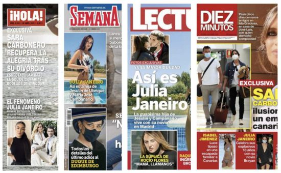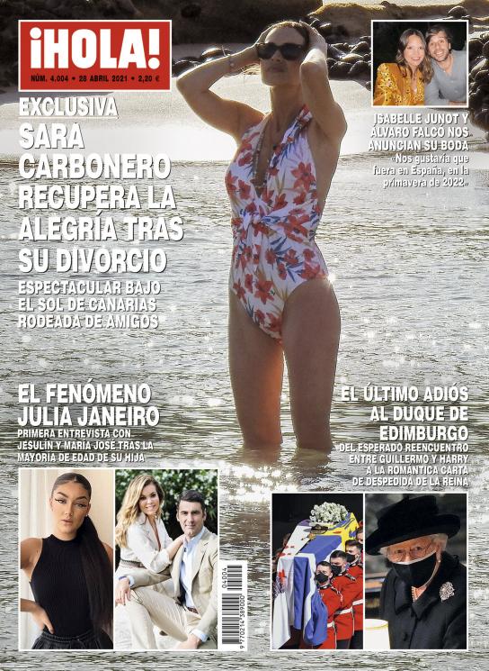 La periodista Sara Carbonero se muestra exultante en la portada de la revista ¡Hola!. Carbonero aparece en traje de baño luciendo figura mientras «recupera la alegría tras su divorcio” de Iker Casillas. El tabloide también se hace eco del fenómeno Julia Janeiro, hija de Jesulín y María José Campanario, que concede su primera entrevista tras su mayoría de edad. ¡Boda a la vista! Isabelle Junot y Álvaro Falcó anuncian su enlace para la primavera de 2022, y el esperado encuentro entre Guillermo y Harry en el funeral de su abuelo, el duque de Edimburgo.