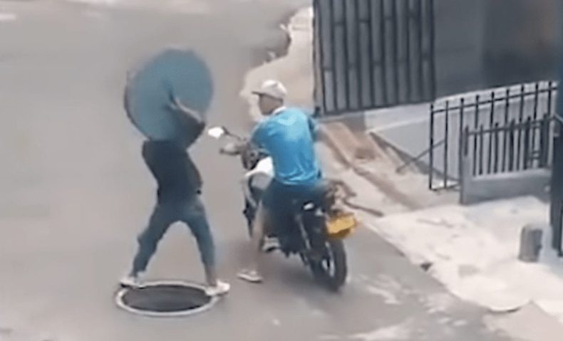 El desastroso intento de robo de la tapa de una alcantarilla en una calle de de Medellín, Colombia, se ha viralizado en las redes sociales, donde los usuarios han calificado la grabación de «justicia divina».