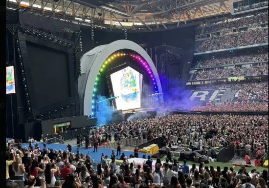 Con su «salgo acicala’ de pie’ a tope» retumbaba el Bernabéu, para acto seguido pasar a ‘El Makinon’, otra de las piezas favoritas del público, ataviado de vestimentas rosas, purpurina y sombreros de cowboy, de color rosa y con purpurina también.