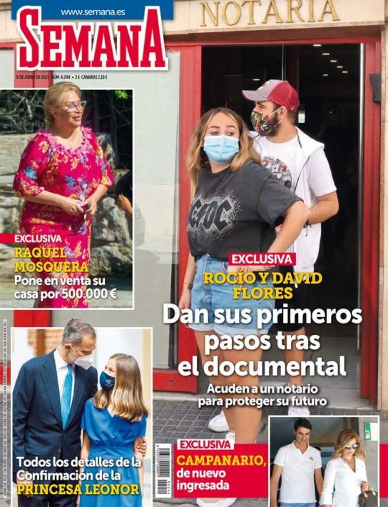 Rocío y David Flores blindan su futuro en el notario tras la emisión del documental ‘Rocío: contar la verdad para seguir viva’. Raquel Mosquera pone a la venta su casa por 500.000 euros ; María José Campanario ingresada de nuevo y la confirmación de la princesa Leonor.