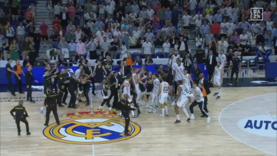 Así, el segundo partido de los cuartos de final entre Real Madrid y Partizán se detuvo con 1 minuto y 40 segundos aún por disputarse, a raíz de un altercado en la cancha y en el que la mayoría de jugadores se involucraron desde ambos banquillos.