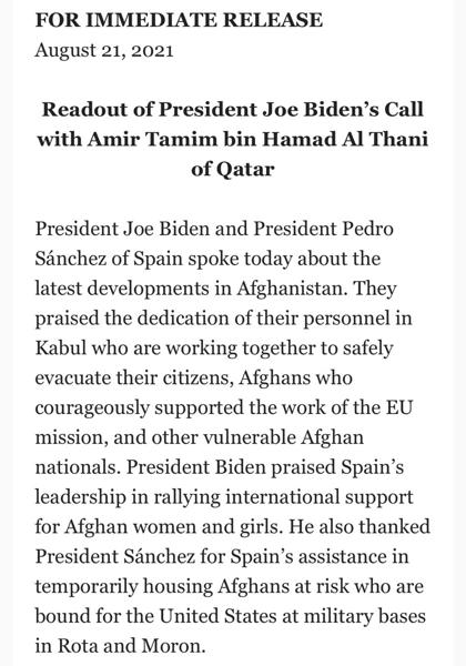La Casa Blanca refejó en la agenda del mandatario estadounidense, Joe Biden, la llamada que tuvo con el presidente de España, Pedro Sánchez, en relación a la colaboración entre ambos países en territorio afgano.