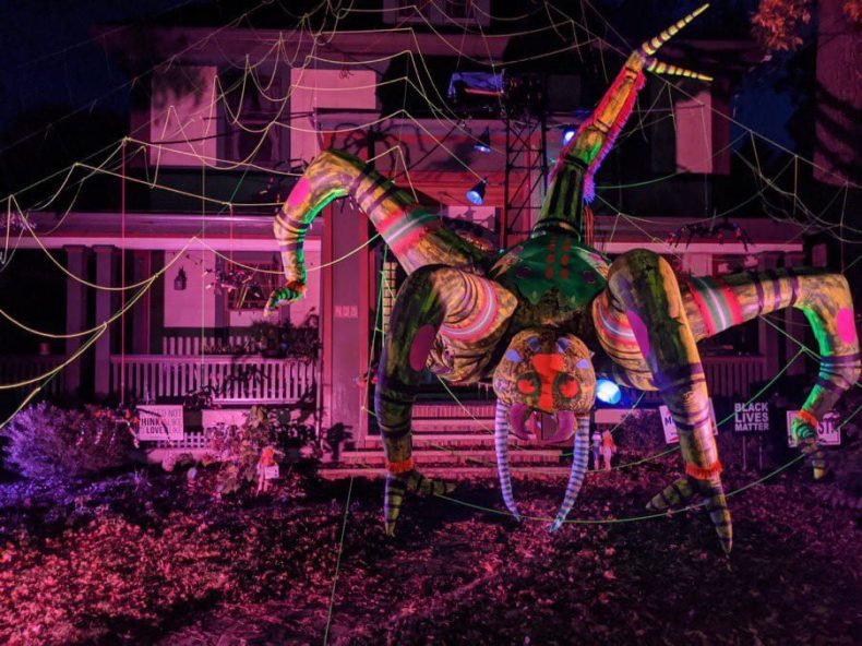 Una decoración de Halloween colocada en la entrada de una casa ha causador furor entre los internautas. Se trata de una gigantesca tela de araña por la cual se desliza un terrorífico arácnido mecanizado no menos grande.