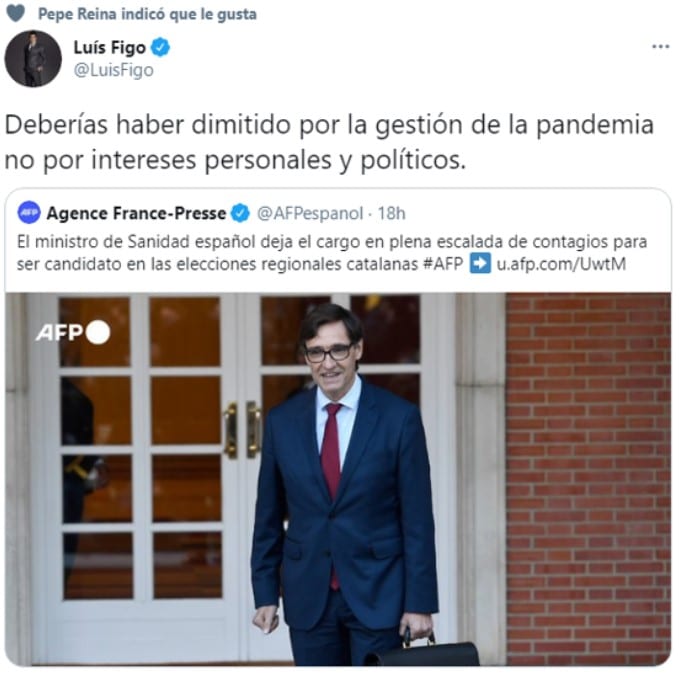 Figo ha publicado en su cuenta de Twitter un mensaje de despedida a Salvador Illa. En la publicación ha compartido una noticia de un medio de comunicación, donde se informaba que el catalán deja el cargo que lleva meses ocupando. Acompañado de su toque personal “Deberías haber dimitido por la gestión de la pandemia no por intereses personales y políticos”.