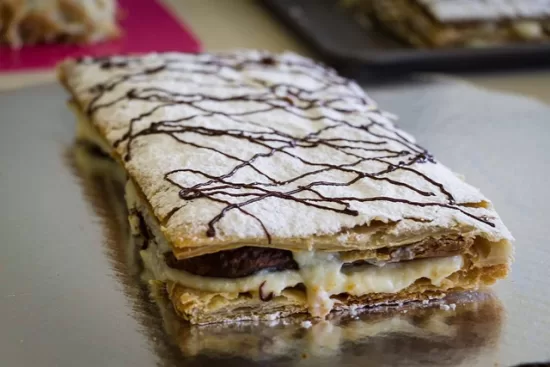 En primer lugar, las milhojas, capas de hojaldre alternadas con crema pastelera o nata montada. Su origen es francés, aunque ha llegado a todos los rincones de Europa. En España, además, se ha innovado y se ha incluido la crema de turrón o cabello de ángel en las recetas de algunas zonas.