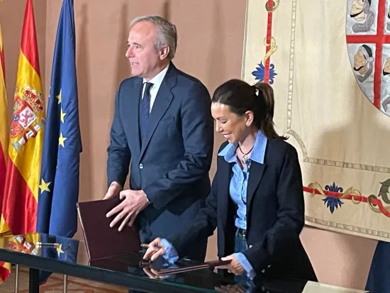 Fernández y Azcón han firmado el convenio en el Salón del Trono de La Aljafería, en un acto al que han asistido el vicepresidente primero del Gobierno, Alejandro Nolasco; la consejera de Presidencia, Interior y Cultura del Ejecutivo, Tomasa Hernández; el director general de Cultura, Pedro Olloqui; los miembros de la Mesa de las Cortes, portavoces de grupos parlamentarios y algunos diputados.