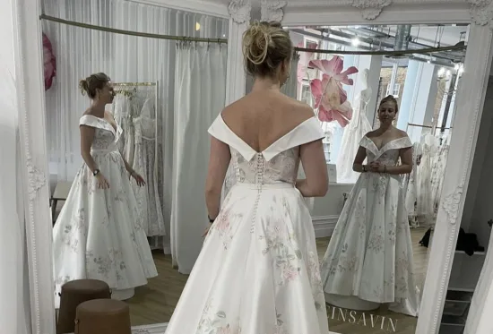 En la imagen, Coates está parada frente a dos espejos con un vestido de novia y, de alguna forma, se muestra en tres poses a la vez.