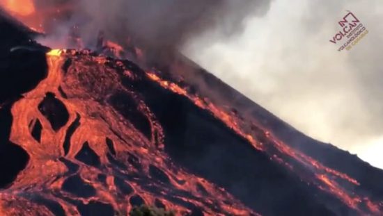 El último informe del Departamento de Seguridad Nacional recoge que en las últimas 24 horas la evolución del volcán está marcada por la lava que continúa fluyendo sobre las coladas existentes, aumentando la altura de las mismas y rellenando las islas entre ellas, situándose la superficie afectada en 879,69 hectáreas.