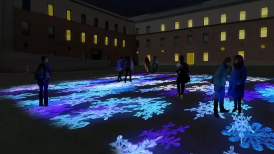 Caminar por este espacio será toda una experiencia. La superficie del patio se transforma en un tapiz de reflejos y formas que nacen, giran y se desvanecen al ritmo de los movimientos de los visitantes. Cada pisada genera un cambio: los cristales digitales se expanden, los colores se iluminan y la escena evoluciona, invitando al público a convertirse en parte activa de una obra de arte que fusiona la belleza de la naturaleza con la sorpresa del mundo navideño.