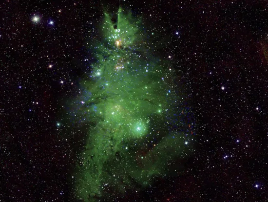 Este “Christmas Tree Cluster”, o NGC 2264, toma su nombre no de su forma sino del brillo de sus estrellas, que iluminan el área circundante como si de las luces de un árbol de Navidad se trataran.