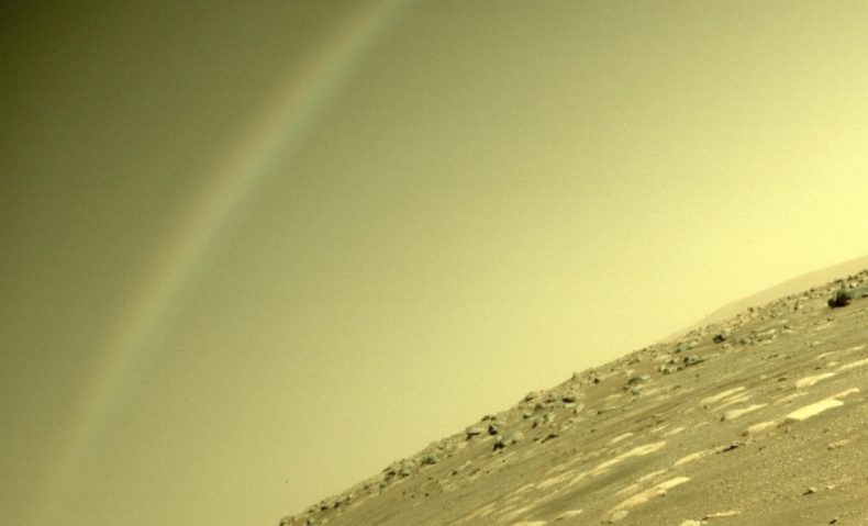 Una imagen capturada por el rover Perseverance el pasado domingo en la superficie de Marte ha dejado desconcertados a los a los científicos. Una de las cámaras de la aeronave, utilizada para para detectar y evitar obstáculos, logró capturar lo que parece ser un arcoíris sobre el firmamento del planeta.