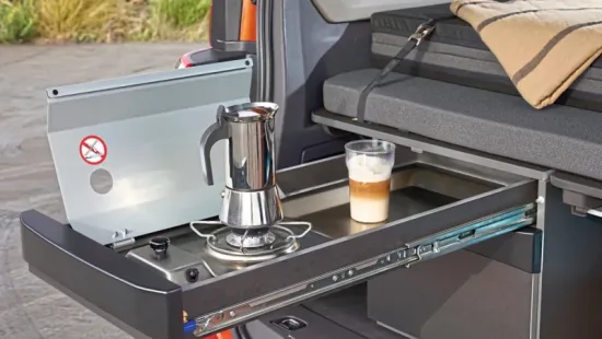 Las cosas se ponen más serias con la versión Beach Camper, que incluye una pequeña unidad de cocina, que se desliza fuera de la parte trasera de la camioneta con el portón trasero abierto. Puede costar cocinar una comida de tres platos en la placa de cocción de un solo fuego, pero hay un cajón para cubiertos y espacio de almacenamiento adicional. También, dispone de una conexión eléctrica de 230 voltios para los campings que ofrecen conexión eléctrica.