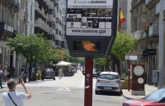 Este jueves se superarán los 40ºC en Badajoz (44ºC), Cáceres (43ºC), Ciudad Real (40ºC), Córdoba (43ºC), Cuenca (40ºC), Granada (40ºC), Guadalajara (42ºC), Jaén (41ºC), Logroño (41ºC), Madrid (41ºC), Ourense (43ºC), Palencia (40ºC), Salamanca (41ºC), Sevilla (45ºC), Teruel (40ºC), Toledo (42ºC), Valladolid (41ºC), Zamora (42ºC) o Zaragoza (41ºC).