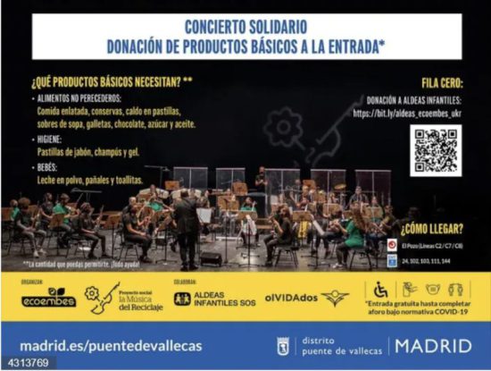 La orquesta ‘La Música del Reciclaje’, del proyecto social de Ecoembes, ofrecerá el próximo domingo 20 de marzo un concierto solidario en beneficio de los afectados por la guerra de Ucrania en Centro Cultural del Pozo del tío Raimundo de Madrid a las 18.00 horas.