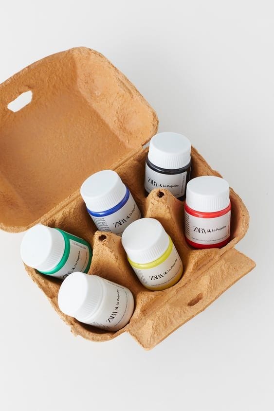 Zara ha apostado por las pinturas de la firma valenciana La Pajarita fabricadas al agua, sin la utilización de materiales como disolventes o aceites y con un envase realizado en cartón reciclable. El kit se compone de 4 piezas básicas preparadas para ser personalizadas