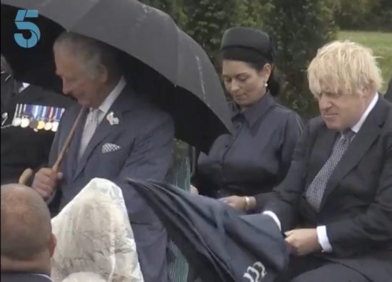 Como es habitual, el tiempo en Reino Unido no acompañó, por lo que el ‘Prime Minister’ se vio obligado a echar mano de su complemento para protegerse de la lluvia.