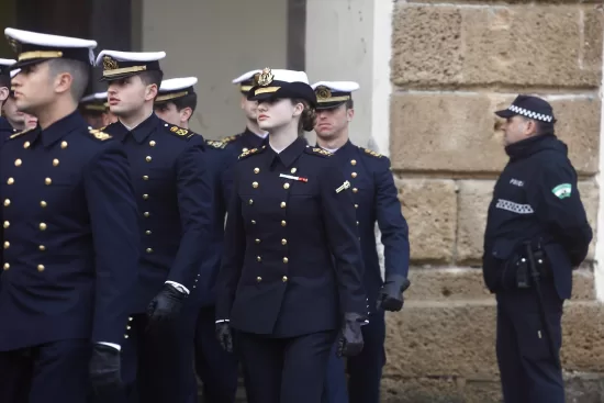 A las 09,00 horas ha llegado Leonor de Borbón, en formación junto al resto de guardiamarinas, permaneciendo en el interior del Ayuntamiento de Cádiz en torno a unos 15 minutos, donde ha firmado en el Libro de Honor. Pasado ese tiempo, la dotación ha vuelto a salir del edificio consistorial.