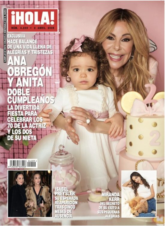 ¡Hola! dedica su portada a Ana Obregón, que ha celebrado un doble cumpleaños: el de los dos de su nieta y el 70 propio; vemos a las dos con un fondo rosa pastel y una enorme tarta. Con tan feliz motivo, concede una entrevista para hacer balance de estos últimos tiempos. Isabel Preysler reaparece tras cinco meses fuera del ojo público y es la modelo Miranda Kerr quien cierra el número para hablar de su éxito y sus “pequeñas alegrías”.