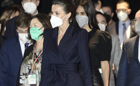 Un traje nuevo de raya diplomática en color azul marino con un punto vanguardista y moderno que… ¡Nos encanta! Y nos encanta por varios motivos; en primer lugar por su originalidad, ya que a pesar de ser un diseño sastre, es completamente distinto al resto de los que cuelgan en su vestidor. En segundo lugar, por su americana, estructurada gracias a marcadas hombreras, con maxi solapas y un fajín ancho estilo fajín para marcar cintura. En tercer lugar, por el pantalón recto, que al ser tobillero deja a la vista los zapatos, dando un punto moderno al look. Y por último, porque la Reina reinventa una vez más el look ‘working girl’ con un traje tan femenino como favorecedor.