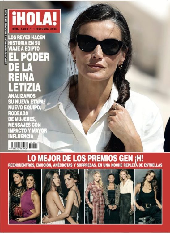 ¡Hola! dedica su portada a la reina Letizia, de blanco y con gafas de sol, durante su reciente viaje a Egipto con el rey Felipe. La revista analiza esta nueva etapa, con nuevo equipo, y mensajes que causan mayor impacto e influencia. El faldón está dedicado a la fiesta de los premios GEN ¡H!, que protagonizaron la portada del miércoles pasado.