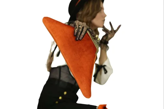 Las carteras de esta colección están disponibles en formas triangulares y se presentan en una gama de colores vibrantes como verde, topo, naranja, mostaza y azul. Están confeccionadas con materiales nobles como algodón y chenilla aterciopelada, lo que les confiere una textura lujosa y una durabilidad excepcional. Además, cada cartera viene con un elegante asa de cadena metálica, que añade un toque de sofisticación.