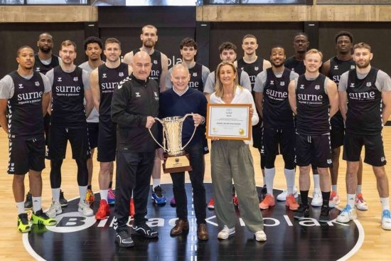 La Salve, doble oro en el Frankfurt International Trophy, entrega sus galardones al Bilbao Basket y a su presidenta Isabel Iturbe como reconocimiento a su trayectoria y al primer título europeo del club.