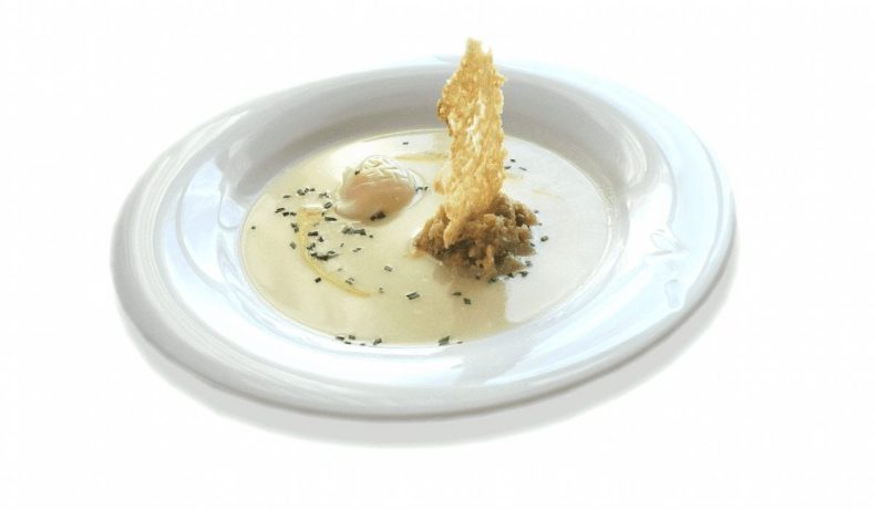 5. Emplatar colocando sobre el fondo puré de cebolla, añadir caldo muy caliente, un huevo y pinchar una lámina de Torta del Casar en la cebolla.