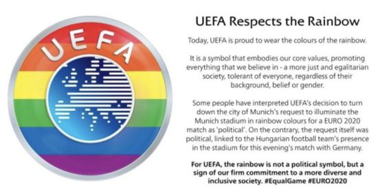 La UEFA expresó su «orgullo» por llevar los colores del arcoíris y aclaró que la prohibición de iluminar el Allianz Arena de Múnich con los colores que simbolizan la lucha del colectivo LGTBI no fue política, aunque sí la petición relacionada con la presencia de Hungría en el estadio.