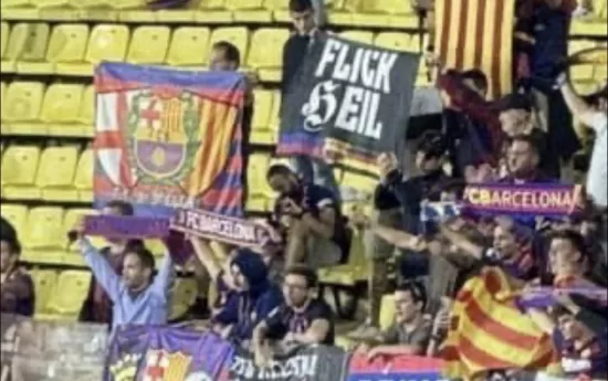 En la zona de la afición blaugrana del feudo monegasco se vio una bandera con una proclama nazi, jugando con el nombre del técnico alemán del Barça, Hansi Flick, con el lema ‘Flick Heil’ en alusión al conocido ‘Sieg Heil’ del nazismo.