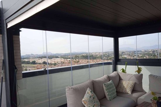 Otra de las estructuras de gran versatilidad a la hora de ampliar un espacio cerrado de la casa tomando áreas expuestas al aire libre son las cortinas de cristal. Estas soluciones pueden ser abatibles o correderas, de control manual, y favorecen el disfrute de un balcón, terraza o porche, tanto en invierno como en verano.