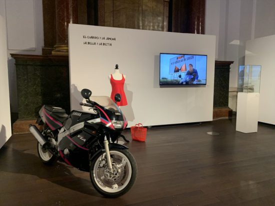 Así, en el espacio que sería el altar de la antigua iglesia en la que se ubica esta sala de exposiciones vallisoletana se han ubicado la motocicleta, el vestido rojo y la cesta de la compra, además de una vitrina que contiene una pila de folios de los guiones, junto a una pantalla en la que se reproduce en bucle la escena en la que Raúl (Bardem) muestra a Silvia (Penélope Cruz) el cartel publicitario para el que sirvió como modelo.