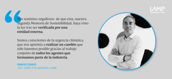 «Nos sentimos orgullosos de que esta, nuestra segunda Memoria de Sostenibilidad, haya visto la luz tras ser verificada por una entidad externa. Algo que muestra nuestro compromiso con la máxima transparencia. De esta forma compartimos nuestra estrategia, compromisos, avances y acciones de mejora para ser una empresa que genere un impacto positivo en el medioambiente y en la sociedad, promoviendo una industria de la iluminación más sostenible. Somos conscientes de la urgencia climática, que nos apremia a realizar un cambio que solo haremos posible gracias al trabajo conjunto de todos los agentes que formamos parte de la industria», comenta Ignasi Cusidó, director general de Lamp.