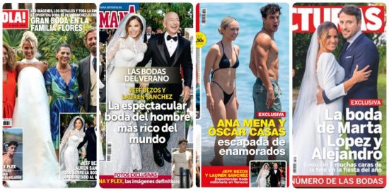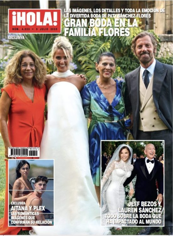 ¡Hola! se vuelca en la boda de Patty Sánchez, hija del exfutbolista Quique Sánchez Flores, con el abogado Javier Millet, que reunió al clan de la Faraona en Jávea (Alicante). En portada vemos a la sonriente joven acompañada de su padre, su abuela, Carmen Flores, y su tía, Lolita. La otra gran boda de la semana tiene también su espacio: se trata de la de Jeff Bezos, el tercer hombre más rico del mundo (Forbes), con Lauren Sánchez. La tercera noticia es también sentimental: Aitana y Plex ya no ocultan su relación y se dejan ver juntos y acaramelados en todas partes.