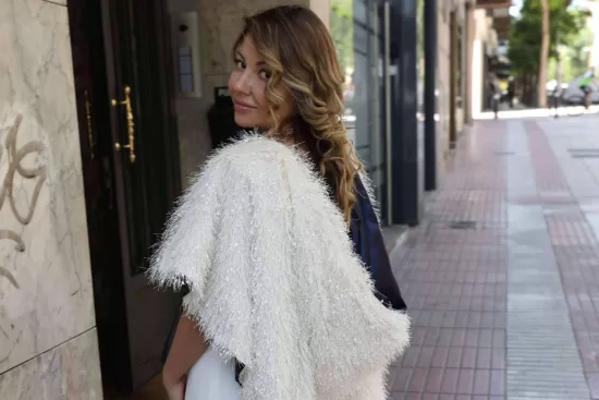 Un ejemplo perfecto es la capa de novia Natalie, modelo único realizado en nuestro taller de novia para una editorial. Este diseño está hecho con un forro de satén azul, con un tejido fantasía de flecos pequeños. Esta capa de novia corta es más corta por delante que por detrás y es muy llamativa.