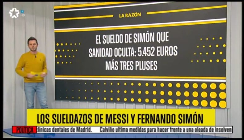 Mientras que Messi cobra millones, el sueldo de Simón se limita a unos miles de euros. Sin embargo la cadena de Telemadrid se ha atrevido a compararlos, lo que ha indignado a las redes sociales. En concreto ha sido un rótulo impreso sobre la noticia donde se podía leer «Los sueldazos de Messi y de Fernando Simón”.