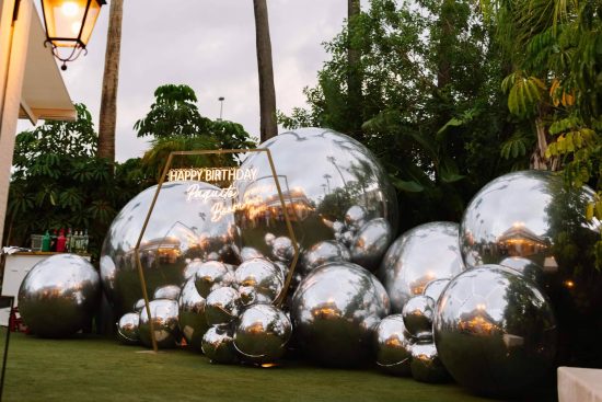 Los globos gigantes destacan por su capacidad para elevar la estética de cualquier celebración o espacio público. Fabricados en tamaños que pueden alcanzar hasta los tres metros de diámetro, estas esferas se utilizan en decoraciones con globos eventos corporativos, lanzamientos de productos o exposiciones temporales. Su superficie reflectante captura la luz natural y artificial, creando efectos ópticos que interactúan con el paisaje circundante, como piscinas o jardines. En instalaciones al aire libre, resisten condiciones climáticas moderadas gracias a materiales como el pvc reforzado o polímeros metálicos. Globomur desarrolla proyectos personalizados donde estas esferas se agrupan en formaciones orgánicas, inspiradas en formas naturales, para generar impacto visual. Un subapartado relevante es su uso en marketing: marcas incorporan logos o colores corporativos en las superficies, convirtiéndolas en herramientas promocionales efectivas, especialmente en eventos corporativos y lanzamientos promocionales de empresas. Otro aspecto es su gran tamaño permitiendo decorar superficies grandes donde su escala maximiza el efecto visual no dejando a nadie inadvertido.