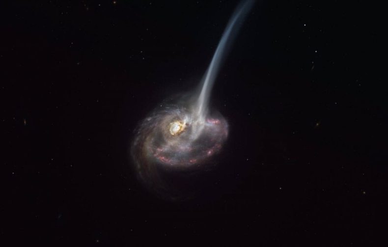 A 9.000 millones de años luz, astrónomos de la Universidad de Durham vieron que una gran cantidad de gas de formación de estrellas era expulsada al universo por la unión de dos galaxias.
