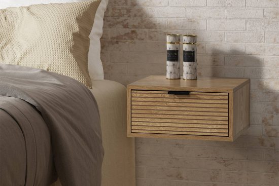 Dentro de las novedades de la firma, destacan las mesitas de noche flotantes, una opción práctica y estética que favorece la sensación de amplitud y orden visual. Modelos como “Tora” o “Rachele” están diseñados para fijarse directamente a la pared, eliminando las patas y dejando el suelo completamente libre. Esta característica no solo mejora la limpieza diaria del dormitorio, sino que aporta un aire moderno y depurado al conjunto decorativo.
