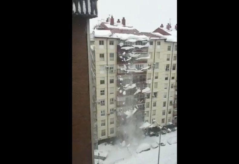 El paso de Filomena nos ha dejado imágenes que ya forman parte del imaginario popular. Una de las últimas ha sido grabada en la localidad madrileña de Alarcón, donde las placas de hielo y nieve formadas en la azotea de un edificio se han desprendido precipitándose al vacío.