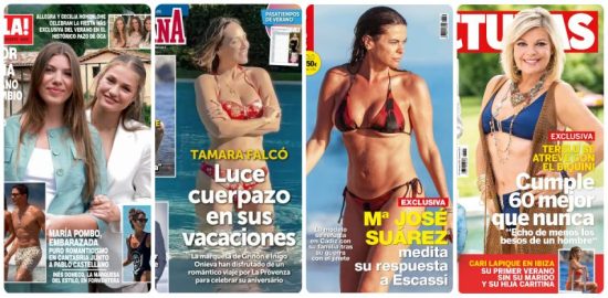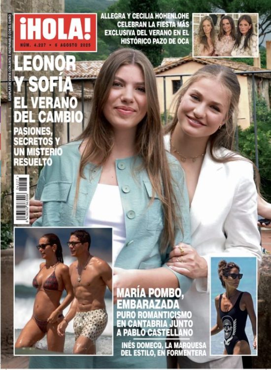 ¡Hola! dedica su portada a la princesa Leonor y la infanta Sofía con un titular enigmático: “El verano del cambio. Pasiones, secretos y un misterio resuelto”. Sobre ellas, Allegra y Cecilia Hohenlohe celebran una fiesta exclusiva en el gallego pazo de Oca y en la parte inferior, imágenes playeras: María Pombo disfruta de las aguas cantábricas y de su embarazo acompañada de su marido, Pablo Castellano, mientras Inés Domecq ha escogido Formentera.