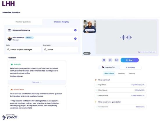 «La combinación de la tecnología puntera de Yoodli con la experiencia en transición profesional de LHH ha dado como resultado una solución bien pensada, pionera y rica en contenido», afirma Varun Puri, director ejecutivo y cofundador de Yoodli. «Los candidatos la describen como una experiencia de simulación inmersiva, especialmente valiosa para aquellos que no han tenido una entrevista en años, están cambiando de trayectoria profesional o tienen oportunidades limitadas y no pueden permitirse fracasar. También es un refuerzo para la confianza de aquellos que se sienten ansiosos por lo que pueda surgir en una entrevista real».