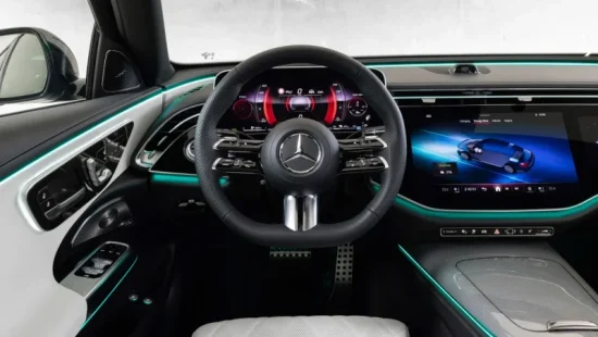 La arquitectura electrónica está más impulsada por el software y menos por el hardware. Las funciones informáticas de dominios previamente separados tienen lugar en un solo procesador. Las pantallas y el sistema de infoentretenimiento MBUX comparten así un nuevo ordenador central de a bordo muy potente. Esta forma de red mejora el rendimiento y la velocidad de los flujos de datos. Con la llave digital del vehículo, el conductor puede arrancar y bloquear la Clase E con un dispositivo compatible. También es posible compartir las llaves: se pueden usar varios canales digitales para invitar a familiares o amigos a usar la Clase E. Al hacerlo, el propietario del vehículo puede asignar diferentes derechos, otorgando solo acceso al vehículo o también permitiendo que sea conducido. El vehículo puede reconocer a varios usuarios a la vez y la llave digital del vehículo puede ser compartida por hasta 16 personas. Con la nueva iluminación ambiental activa (opcional) con visualización de sonido, los ocupantes también pueden «ver» pistas de música y los sonidos de películas o aplicaciones. La visualización tiene lugar en la banda de luz de Active Ambient Lighting. Por ejemplo, las secuencias rápidas de ritmos pueden provocar cambios de luz rápidos, mientras que los ritmos fluidos pueden crear estados de ánimo de iluminación que se fusionan suavemente.