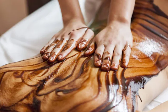 La chocolaterapia es un tratamiento terapéutico en el que se unta y envuelve el cuerpo con capas de chocolate, para posteriormente proceder a realizar masajes relajantes. Este tratamiento combina diferentes propósitos. En primer lugar, se utiliza el chocolate como elemento principal del proceso, el cual es rico en antioxidantes que ayudan a nutrir la piel, combatir los radicales libres y retrasar el envejecimiento. Además, los minerales y vitaminas del chocolate ayudan a tonificar e hidratar la piel, haciendo que luzca más joven y radiante. En segundo lugar, la chocolaterapia es una terapia efectiva para reducir el estrés y relajar el cuerpo de las tensiones acumuladas. Esto se logra a través de masajes especializados que, combinados con la textura de las mascarillas de cacao y el delicioso aroma que desprende, produce altos niveles de relajación física y emocional. Otros beneficios de esta maravillosa terapia es que reduce la inflamación de los vasos sanguíneos y de las manchas demonológicas, previene y trata la celulitis y ayuda a la creación de colágeno.